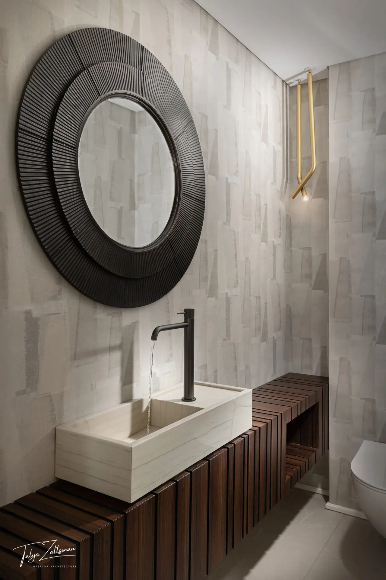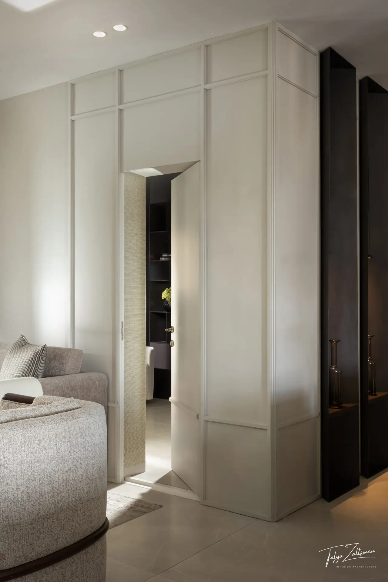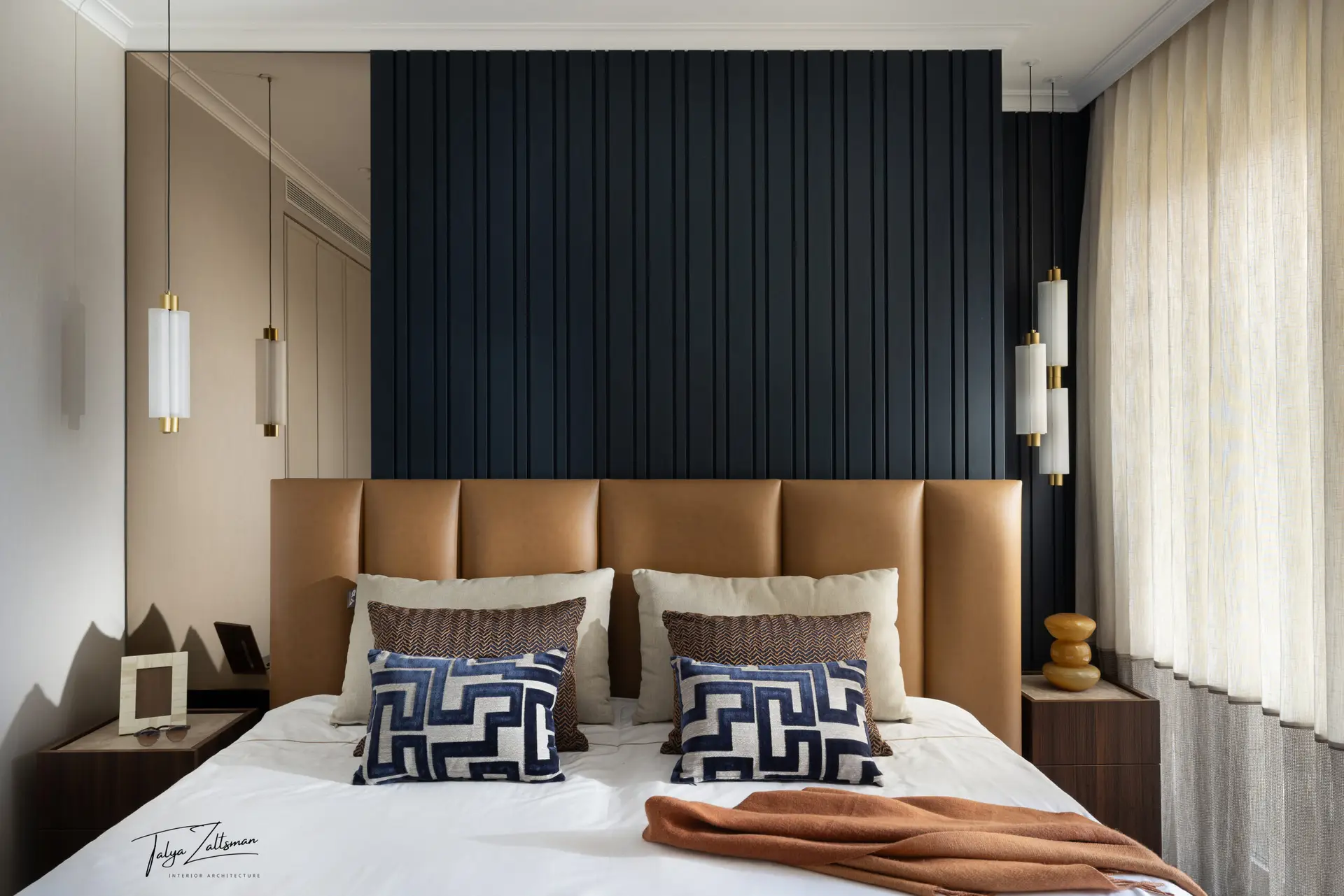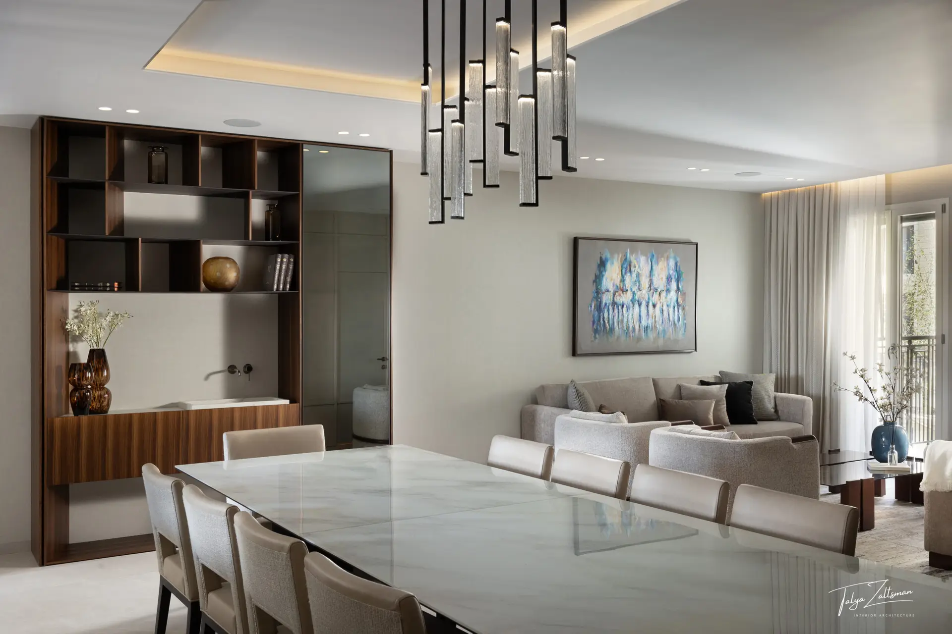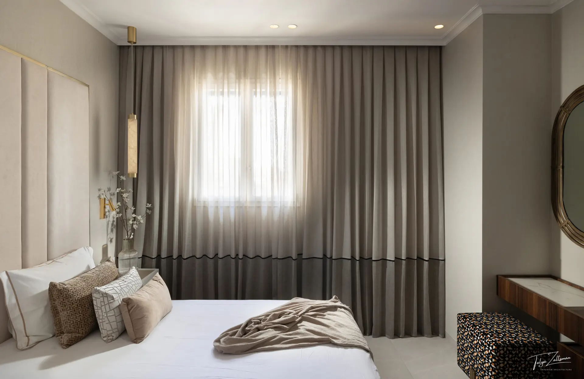 The Contrast Apartment was designed in a bold, contemporary language, featuring graphic wallpapers with sharp geometric lines and a mix of deep, daring colors alongside soft, light tones. The walls became expressive focal elements, adding drama and visual interest to the space without losing a sense of order and precision. The combination of raw textures with soft fabrics and furnishings creates a fascinating dialogue between strength and intimacy – a modern urban apartment with a truly distinctive presence.