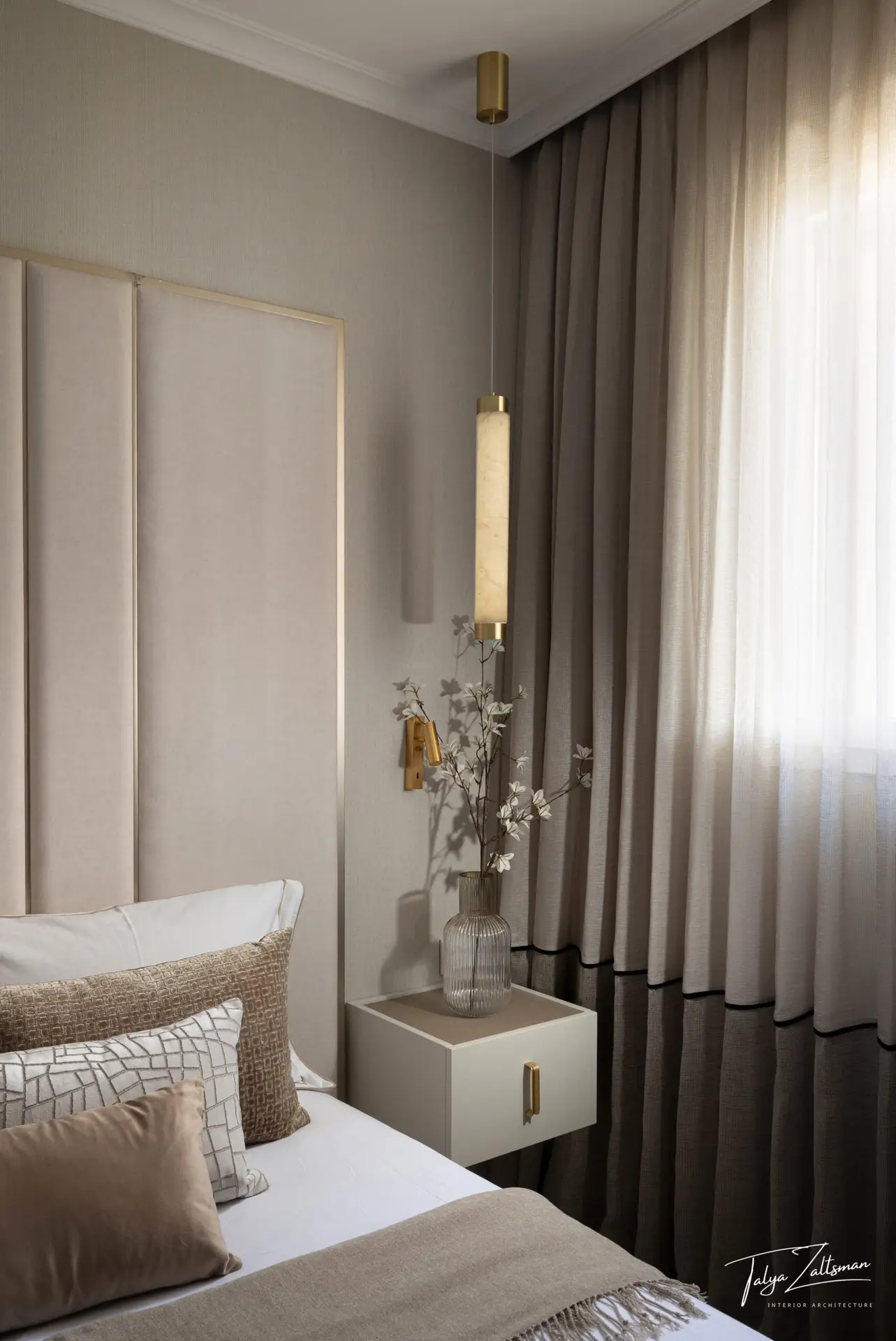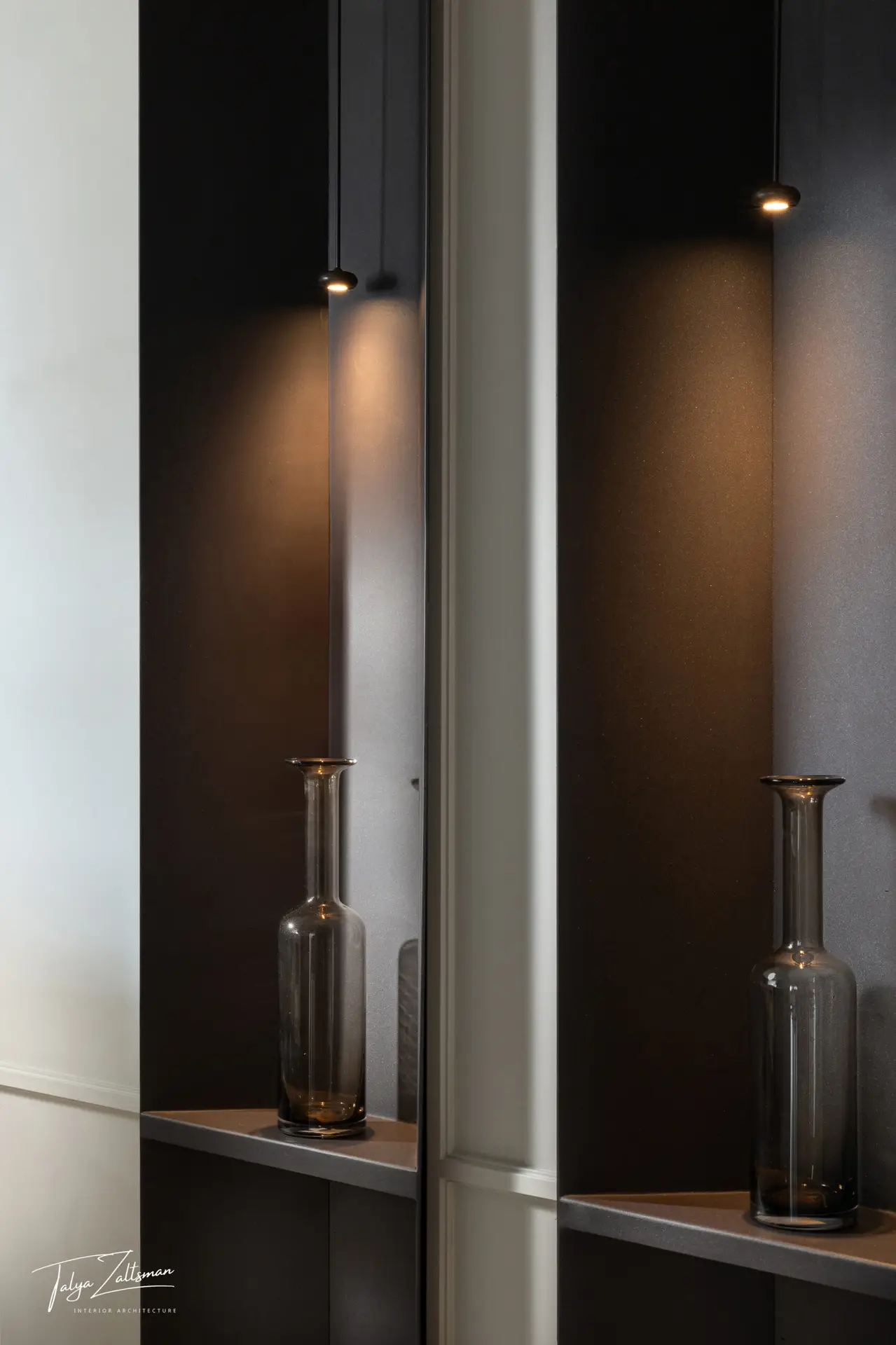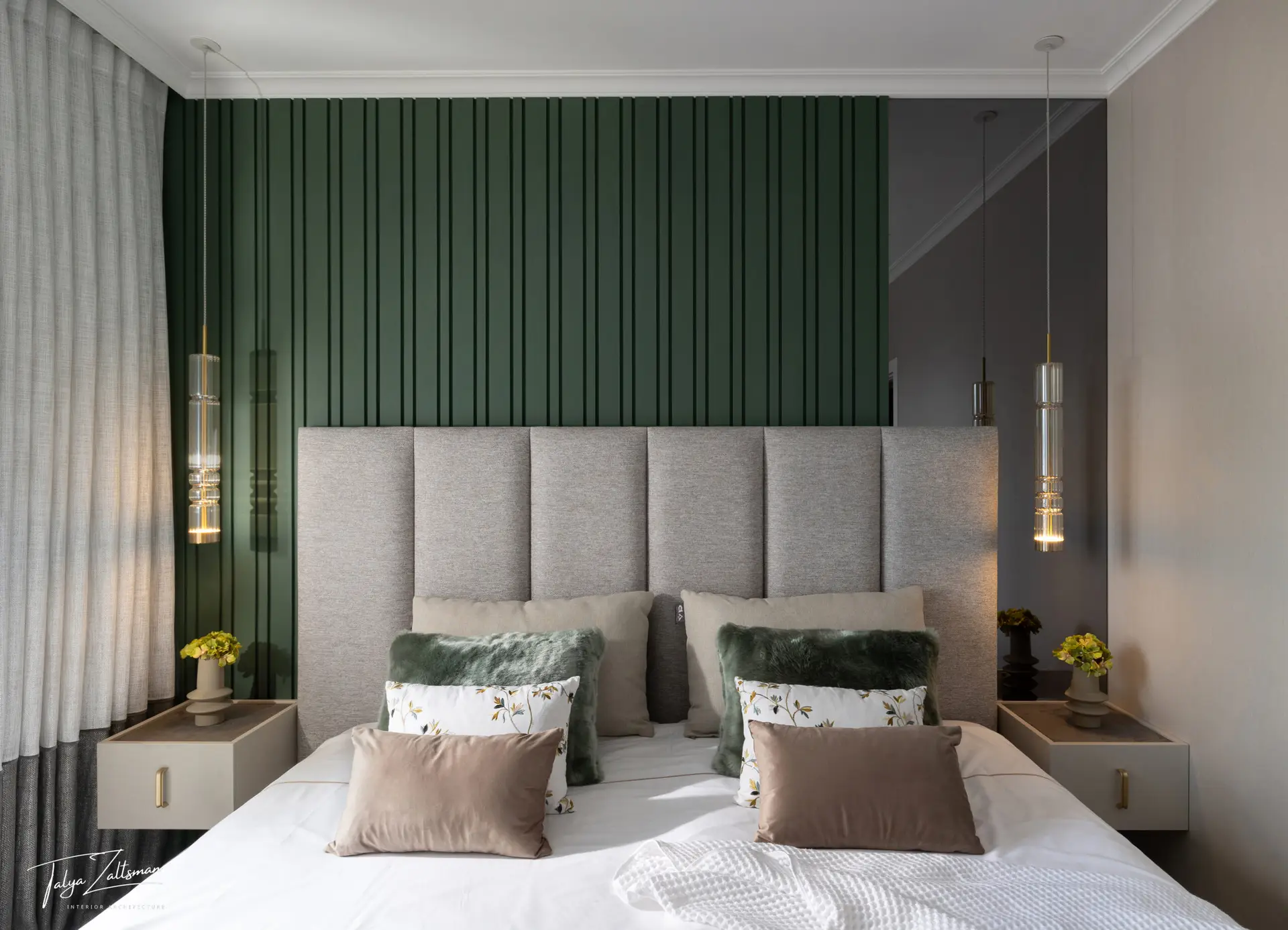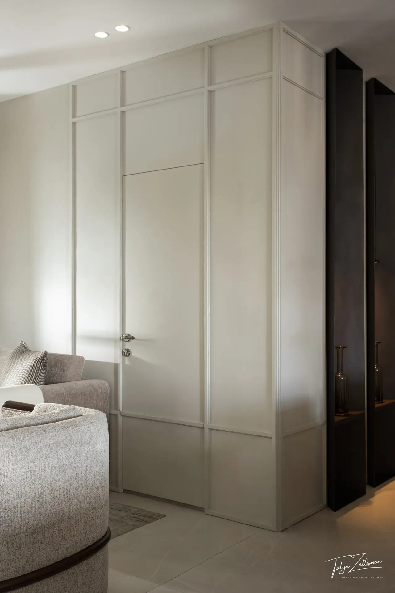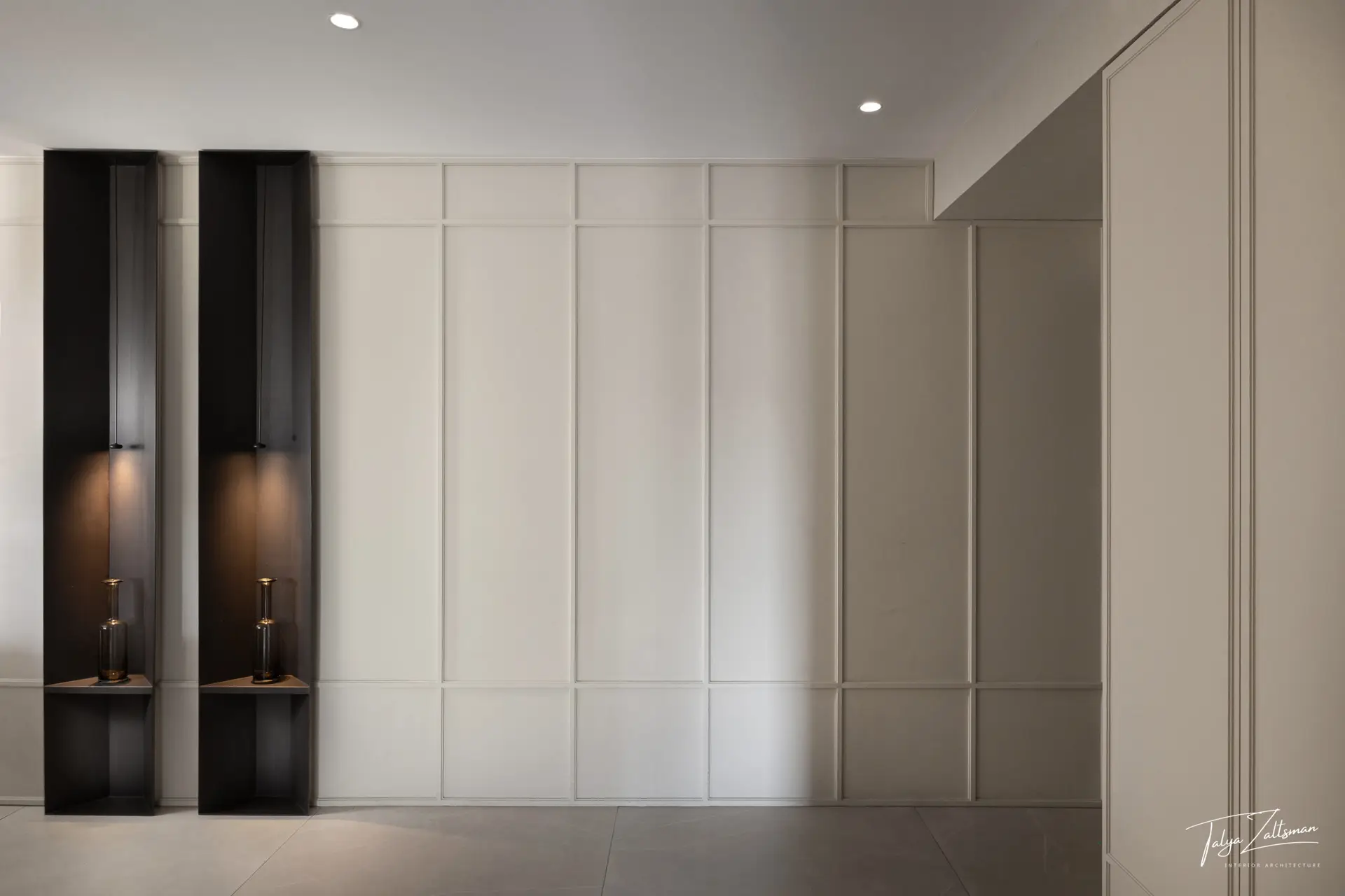 The Contrast Apartment was designed in a bold, contemporary language, featuring graphic wallpapers with sharp geometric lines and a mix of deep, daring colors alongside soft, light tones. The walls became expressive focal elements, adding drama and visual interest to the space without losing a sense of order and precision. The combination of raw textures with soft fabrics and furnishings creates a fascinating dialogue between strength and intimacy – a modern urban apartment with a truly distinctive presence.