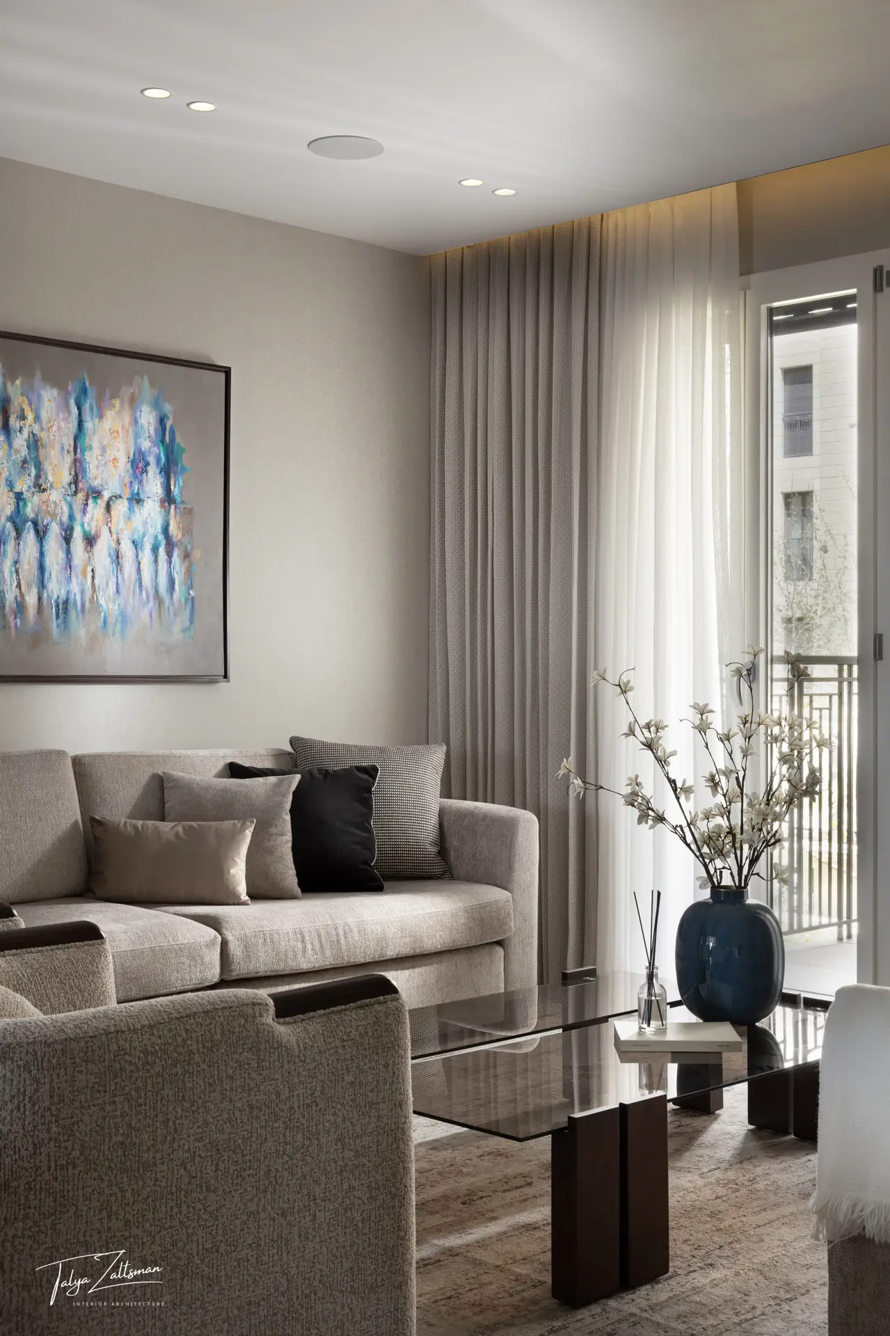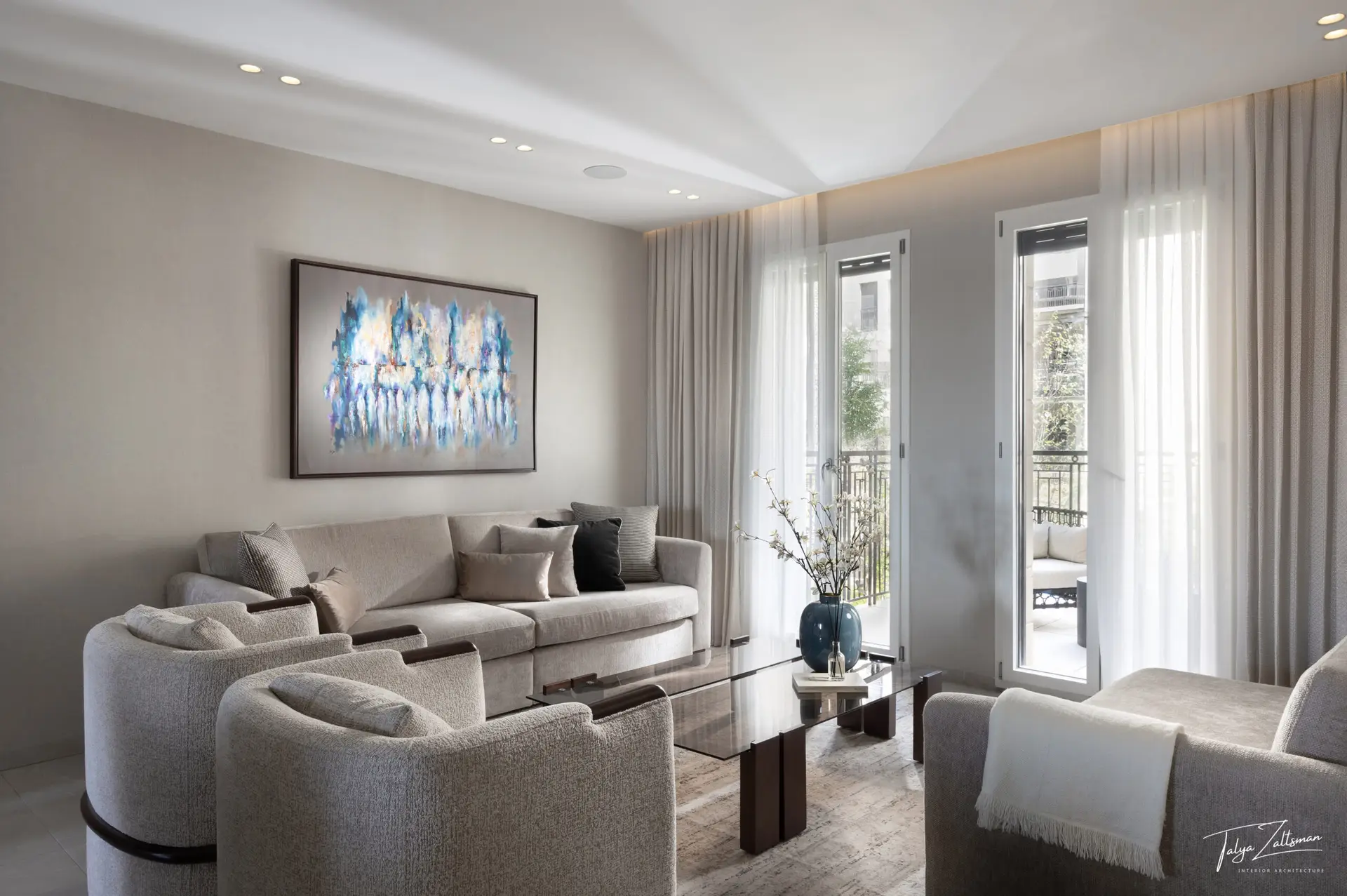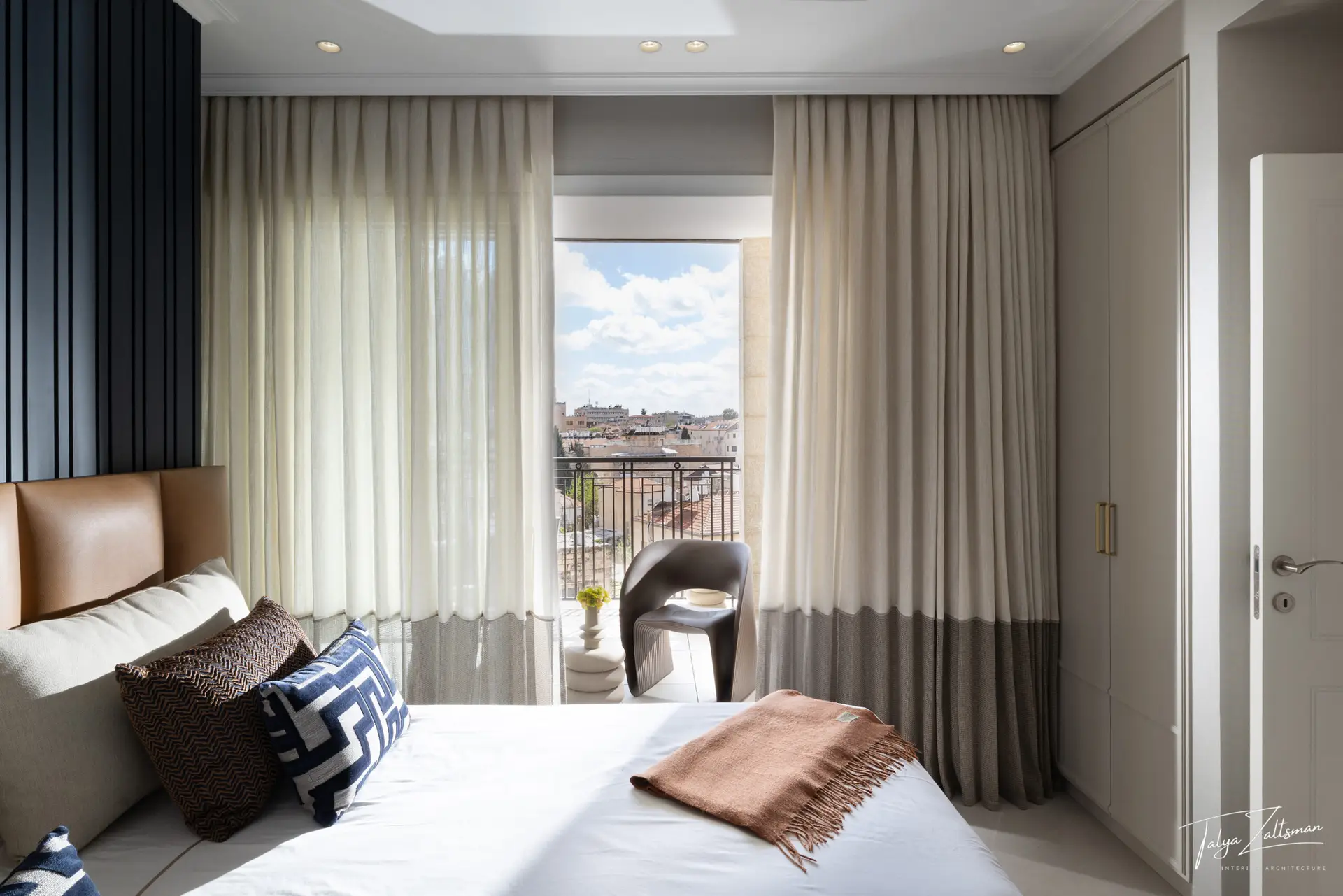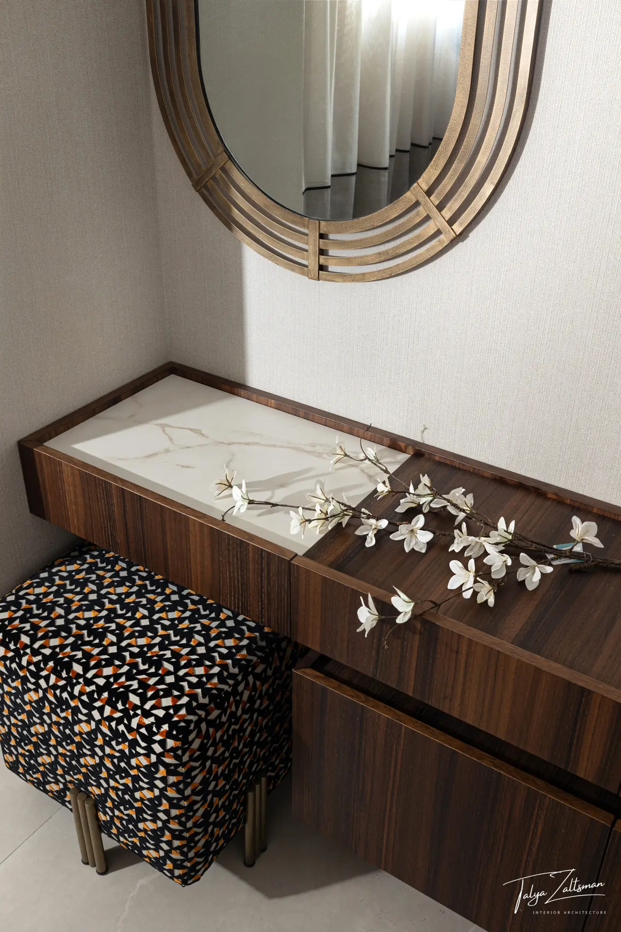 The Contrast Apartment was designed in a bold, contemporary language, featuring graphic wallpapers with sharp geometric lines and a mix of deep, daring colors alongside soft, light tones. The walls became expressive focal elements, adding drama and visual interest to the space without losing a sense of order and precision. The combination of raw textures with soft fabrics and furnishings creates a fascinating dialogue between strength and intimacy – a modern urban apartment with a truly distinctive presence.