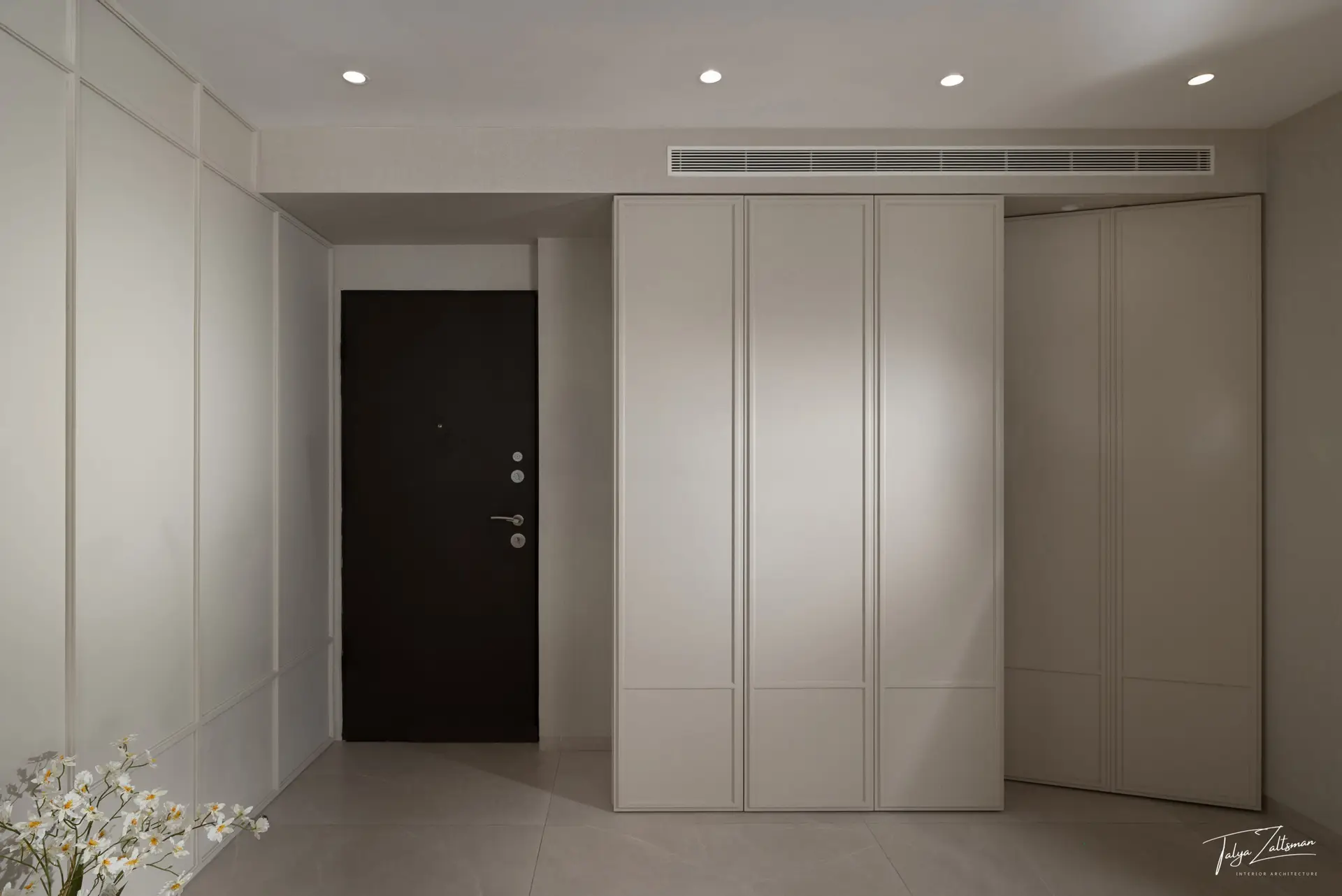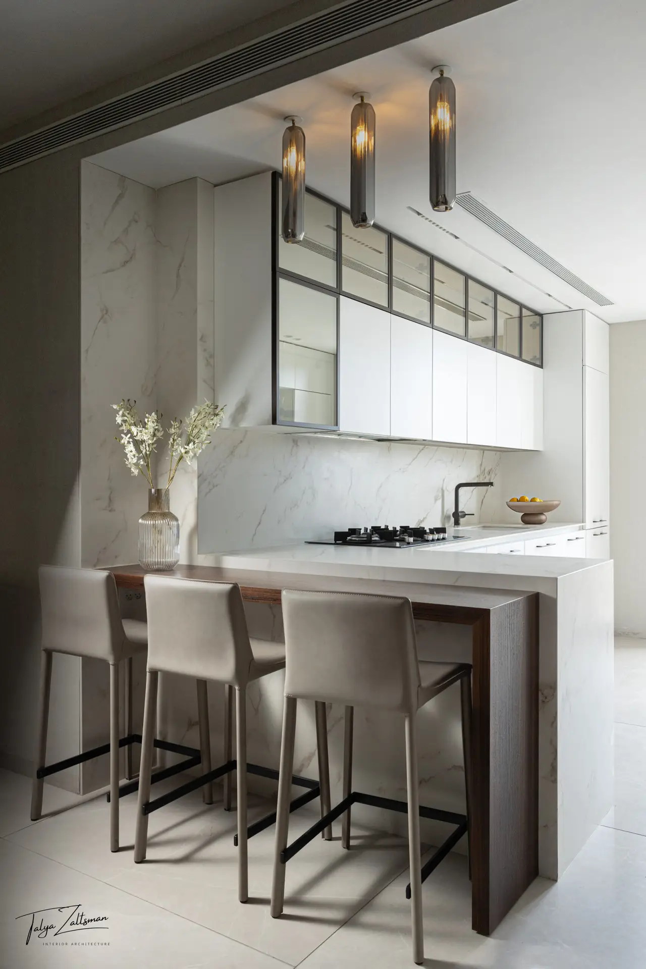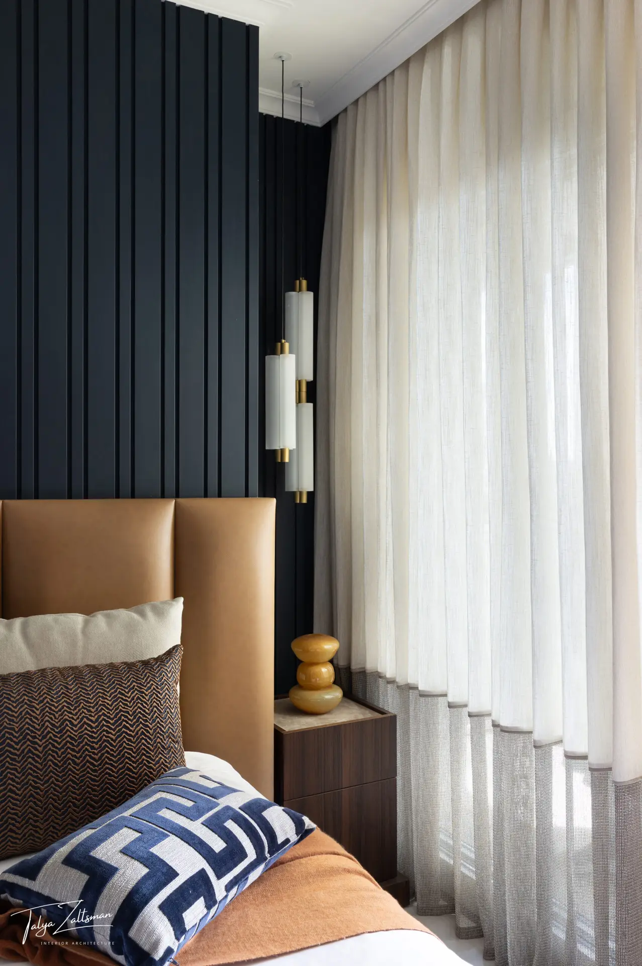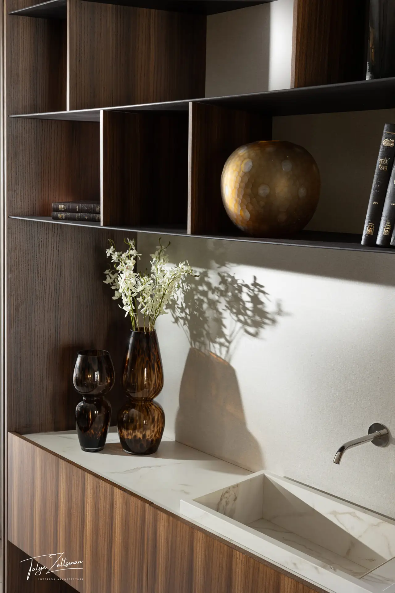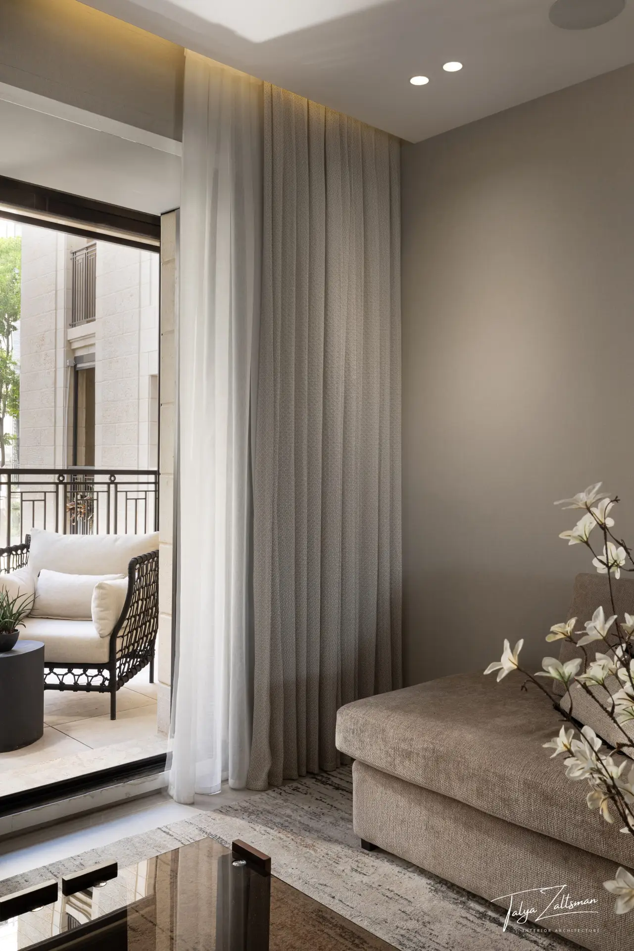 The Contrast Apartment was designed in a bold, contemporary language, featuring graphic wallpapers with sharp geometric lines and a mix of deep, daring colors alongside soft, light tones. The walls became expressive focal elements, adding drama and visual interest to the space without losing a sense of order and precision. The combination of raw textures with soft fabrics and furnishings creates a fascinating dialogue between strength and intimacy – a modern urban apartment with a truly distinctive presence.