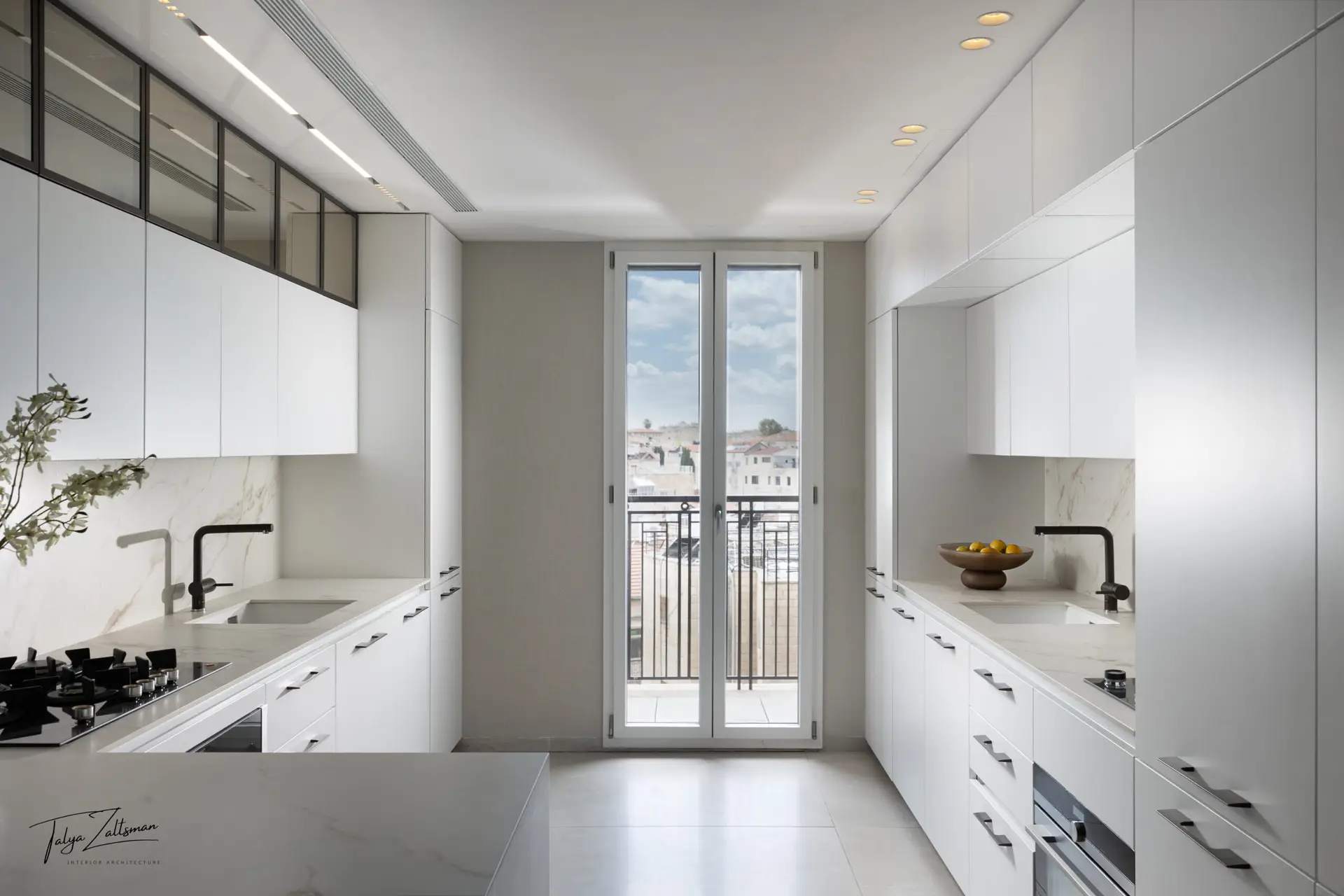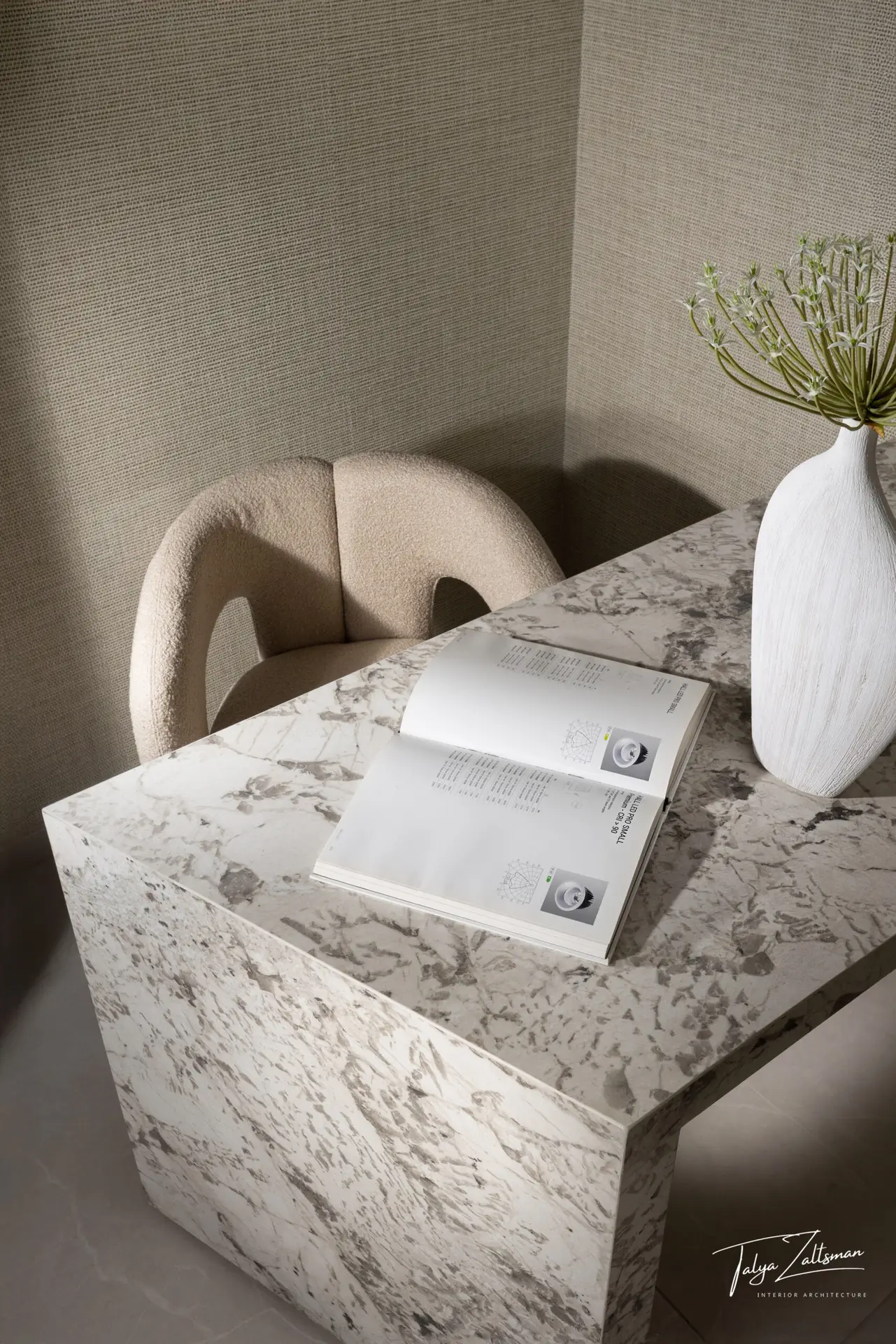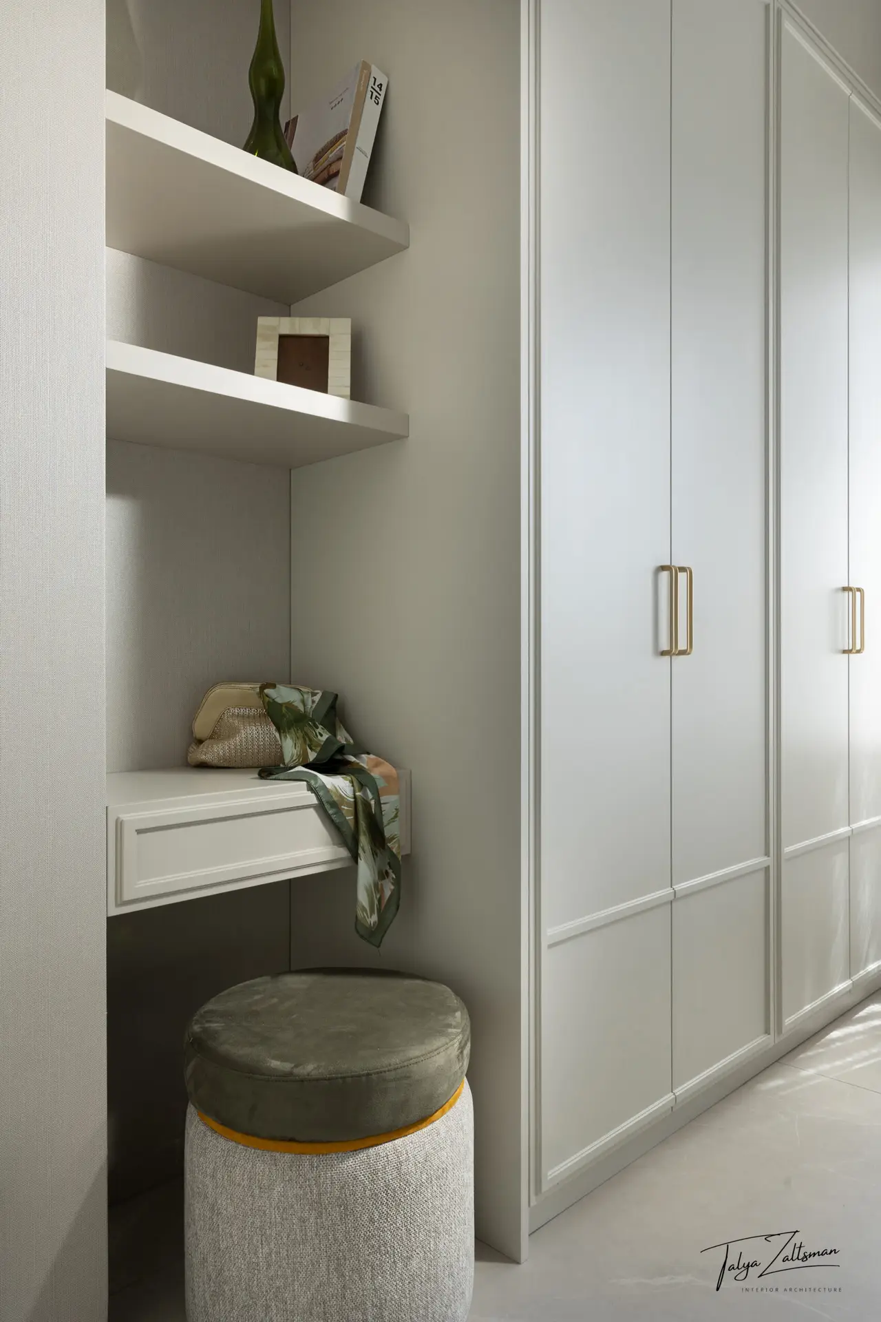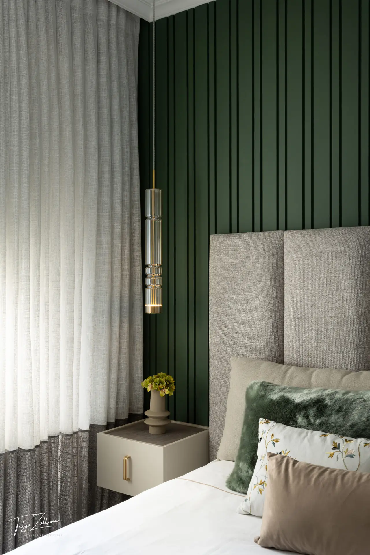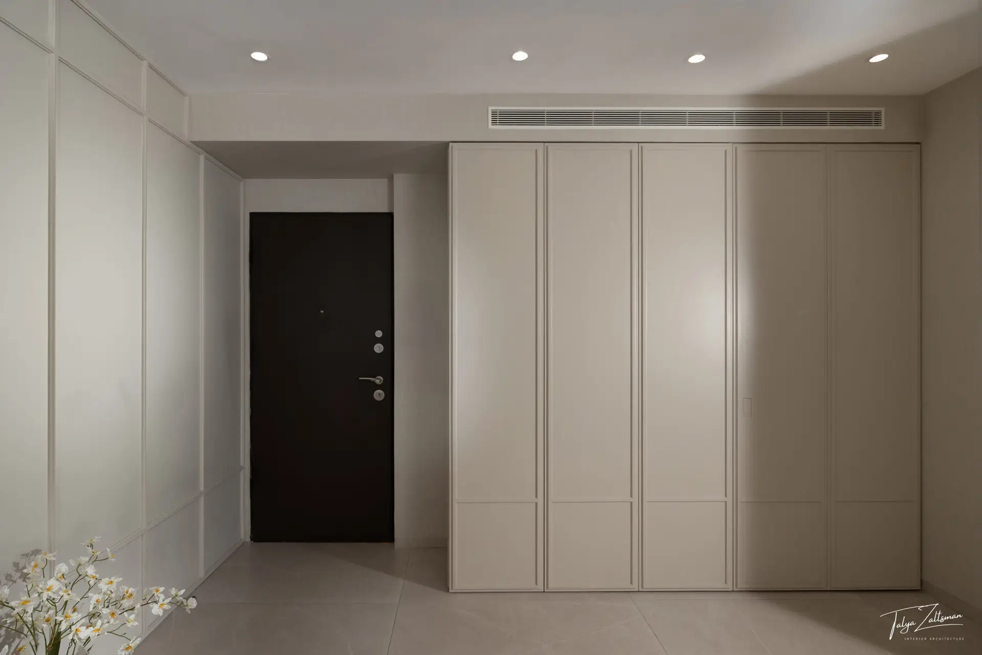 The Contrast Apartment was designed in a bold, contemporary language, featuring graphic wallpapers with sharp geometric lines and a mix of deep, daring colors alongside soft, light tones. The walls became expressive focal elements, adding drama and visual interest to the space without losing a sense of order and precision. The combination of raw textures with soft fabrics and furnishings creates a fascinating dialogue between strength and intimacy – a modern urban apartment with a truly distinctive presence.